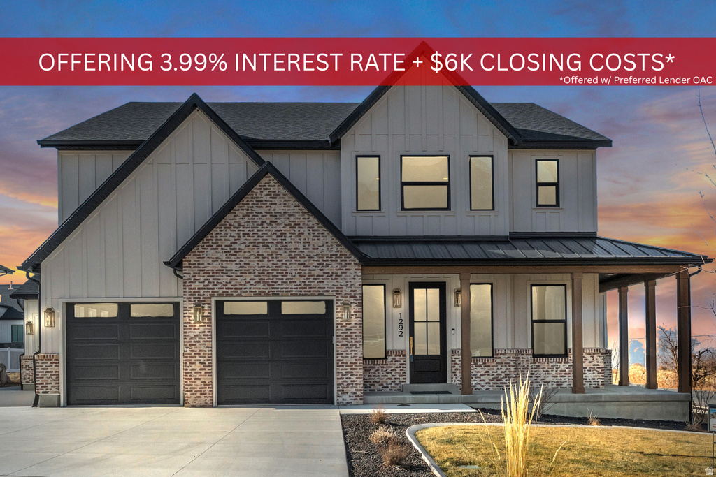 **Offering a 4.75% starting interest rate via a seller-paid 2/1 buy down and closing costs paid up to $6k. **Buyer must qualify through Seller's Preferred Lender to obtain rate buydown. Nestled on a scenic corner lot in Salem, Utah, this stunning farmhouse-style home offers the perfect blend of rustic charm coupled with modern touches, all framed by breathtaking views of the mountains and Utah Lake from the expansive back porch. Featuring 7 spacious bedrooms, big bathrooms, and thoughtfully designed living areas, this home is ideal for gatherings and entertaining. The interior boasts beautiful wood beams, elegant lighting, and custom tile work that add warmth and sophistication throughout. With 3 porches featuring overhangs, a 3-car garage, and abundant storage space, there's room for everything you need. The downstairs snack bar and theater room make for the ultimate gathering spaces, while the open layout ensures a comfortable flow between rooms. Whether you're relaxing on the porch or enjoying cozy nights indoors, this home is designed to fit every stage of life. Don't miss the chance to experience farmhouse elegance and unparalleled views in one of Salem's most desirable locations. This house is equipped with GE Cafe appliances as well as many other designer brands such as Ralph Lauren lighting throughout the house.